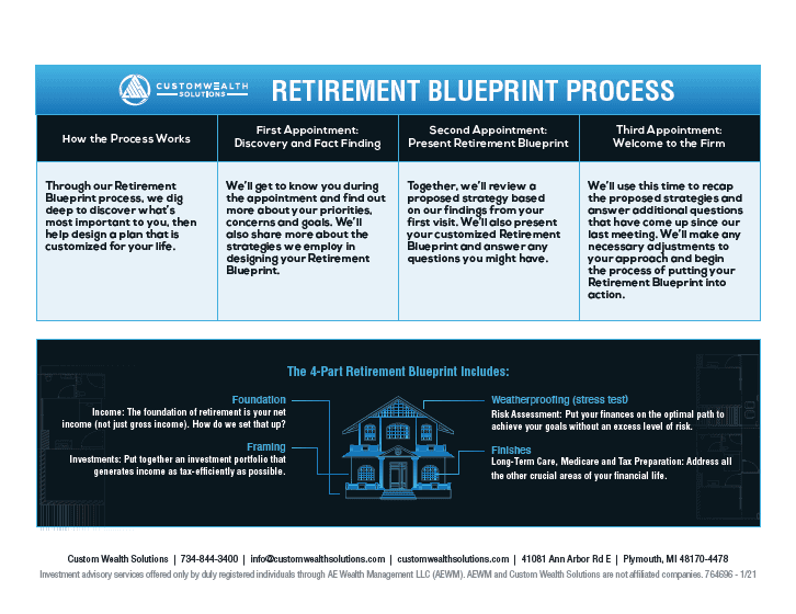 The Custom Wealth Solutions Retirement Blueprint is your roadmap to the confident financial future you've always wanted. Learn how our proven process helps you see all your options and make smart decisions about income, protection, and legacy.